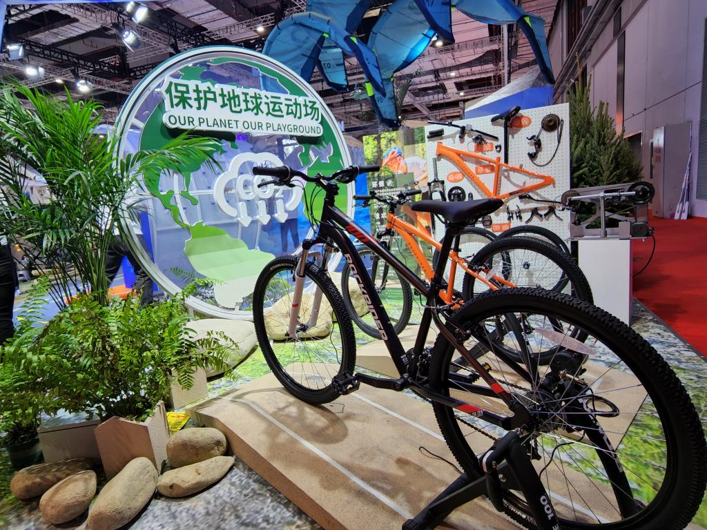 第五屆進(jìn)博會消費(fèi)品展區(qū)迪卡儂的全球首發(fā)新品——生態(tài)設(shè)計(jì)山地自行車。新華社記者 王默玲 攝