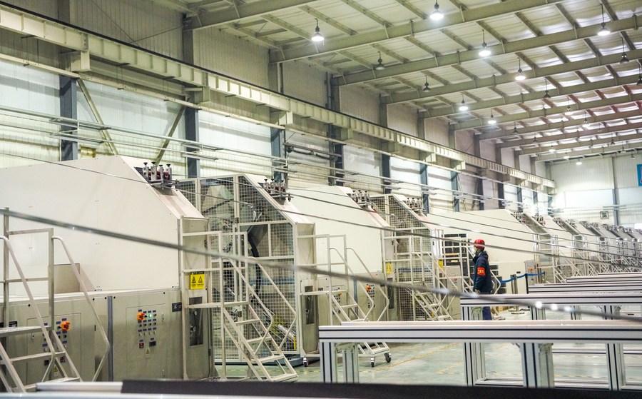 工人在吉林化纖集團(tuán)吉林國(guó)興復(fù)合材料有限公司拉擠車間工作(1月31日攝)。新華社記者 顏麟蘊(yùn) 攝
