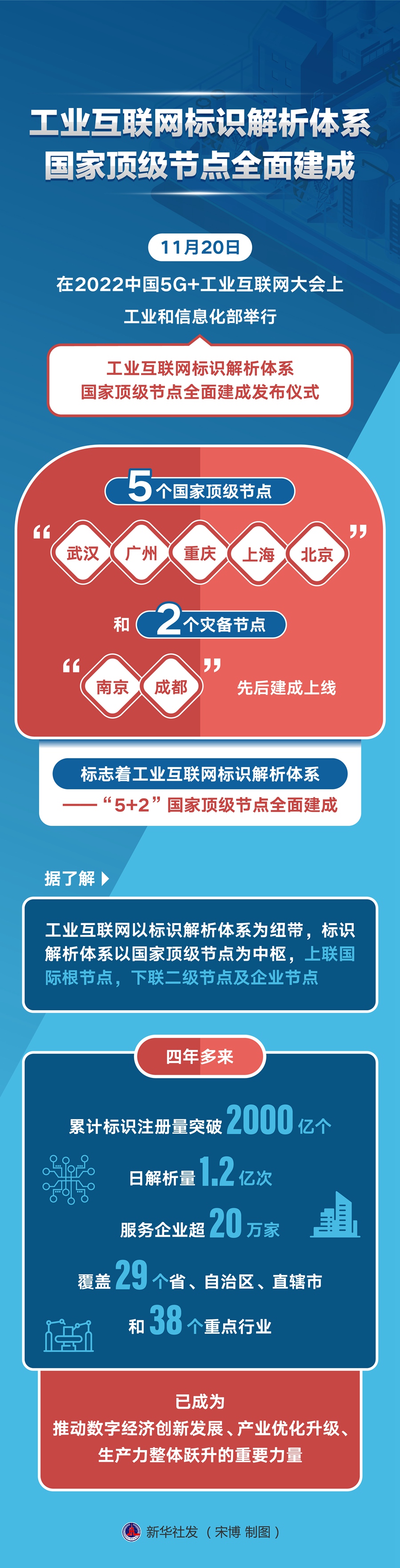 新華社武漢11月20日電 20日,在2022中國(guó)5G+工業(yè)互聯(lián)網(wǎng)大會(huì)上,工業(yè)和信息化部舉行工業(yè)互聯(lián)網(wǎng)標(biāo)識(shí)解析體系國(guó)家頂級(jí)節(jié)點(diǎn)全面建成發(fā)布儀式,標(biāo)志著工業(yè)互聯(lián)網(wǎng)標(biāo)識(shí)解析體系——“5+2”國(guó)家頂級(jí)節(jié)點(diǎn)全面建成。