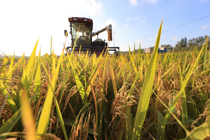 2025年10月16日,在江蘇省連云港市贛榆區(qū)城頭鎮(zhèn)中青墩村,種植戶駕駛收割機搶收水稻。新華社發(fā)(司偉攝)