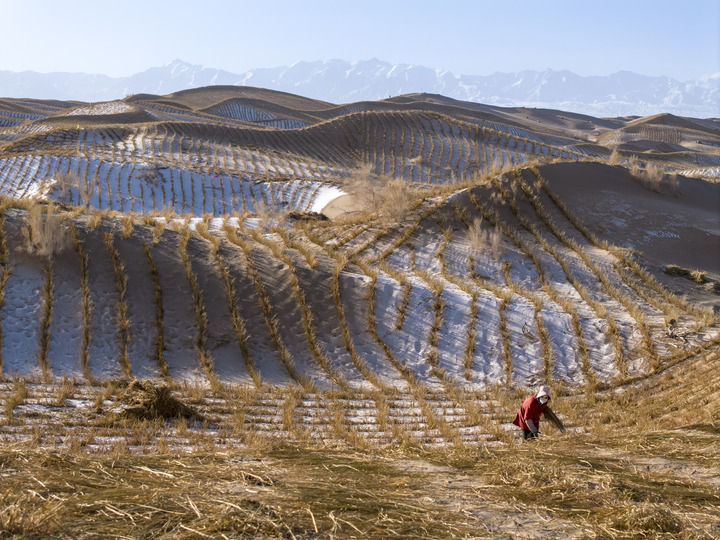 施工人員在甘肅省酒泉市阿克塞哈薩克族自治縣的庫(kù)姆塔格沙漠鋪設(shè)沙障(2025年12月13日攝,無(wú)人機(jī)照片)。新華社發(fā)(高宏善攝)