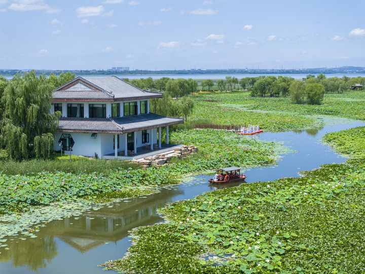 山西省長(zhǎng)治市漳澤湖國(guó)家城市濕地公園一景(2025年7月5日攝,無(wú)人機(jī)照片)。新華社發(fā)(孫兵兵攝)