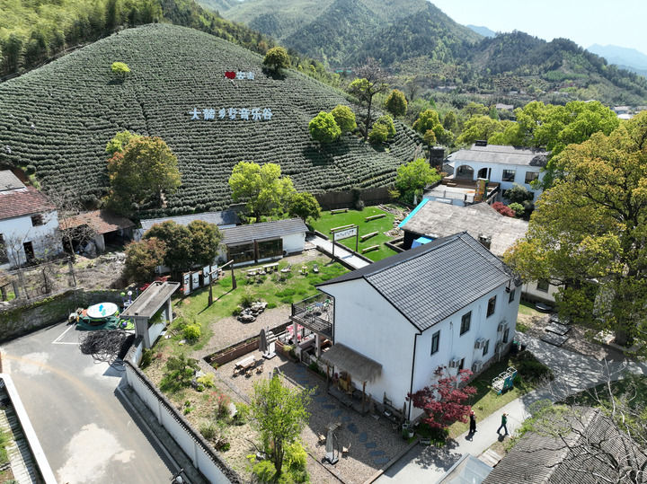 在浙江省安吉縣上墅鄉(xiāng)上墅村,茶山和一個(gè)鄉(xiāng)村文旅項(xiàng)目結(jié)合在一起(2024年4月9日攝,無(wú)人機(jī)照片)。新華社記者 翁忻旸 攝