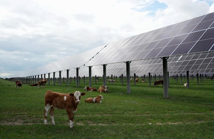 牛群在河北省圍場(chǎng)滿族蒙古族自治縣御道口鎮(zhèn)附近的一處“牧光互補(bǔ)”光伏發(fā)電場(chǎng)吃草(2024年7月25日攝)。新華社記者 楊世堯 攝