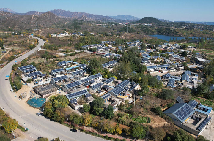 河北省平山縣西柏坡鎮(zhèn)北莊村兆瓦級(jí)“光儲(chǔ)”智能微電網(wǎng)示范工程項(xiàng)目中的屋頂光伏發(fā)電板(2025年11月2日攝,無(wú)人機(jī)照片)。新華社記者 楊世堯 攝