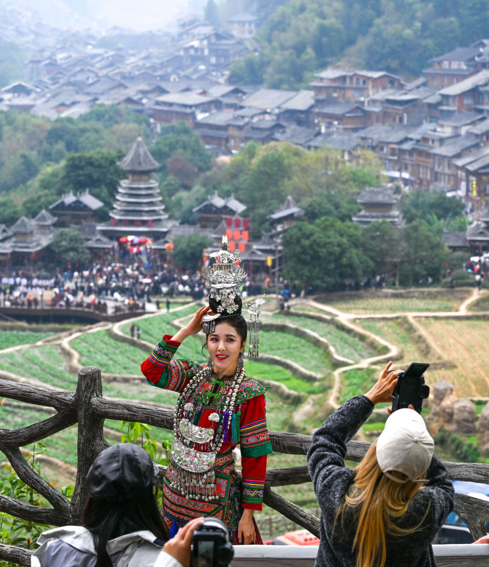 游客在貴州省黎平縣肇興侗寨觀景臺(tái)留影(2025年12月20日攝)。新華社記者 楊文斌 攝