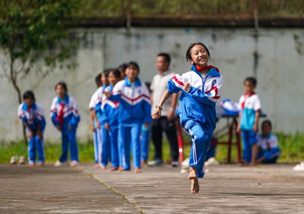 在云南省普洱市孟連傣族拉祜族佤族自治縣,臘福小學(xué)學(xué)生課間在操場進行奔跑接力比賽(2025年9月15日攝)。新華社記者 陳欣波 攝