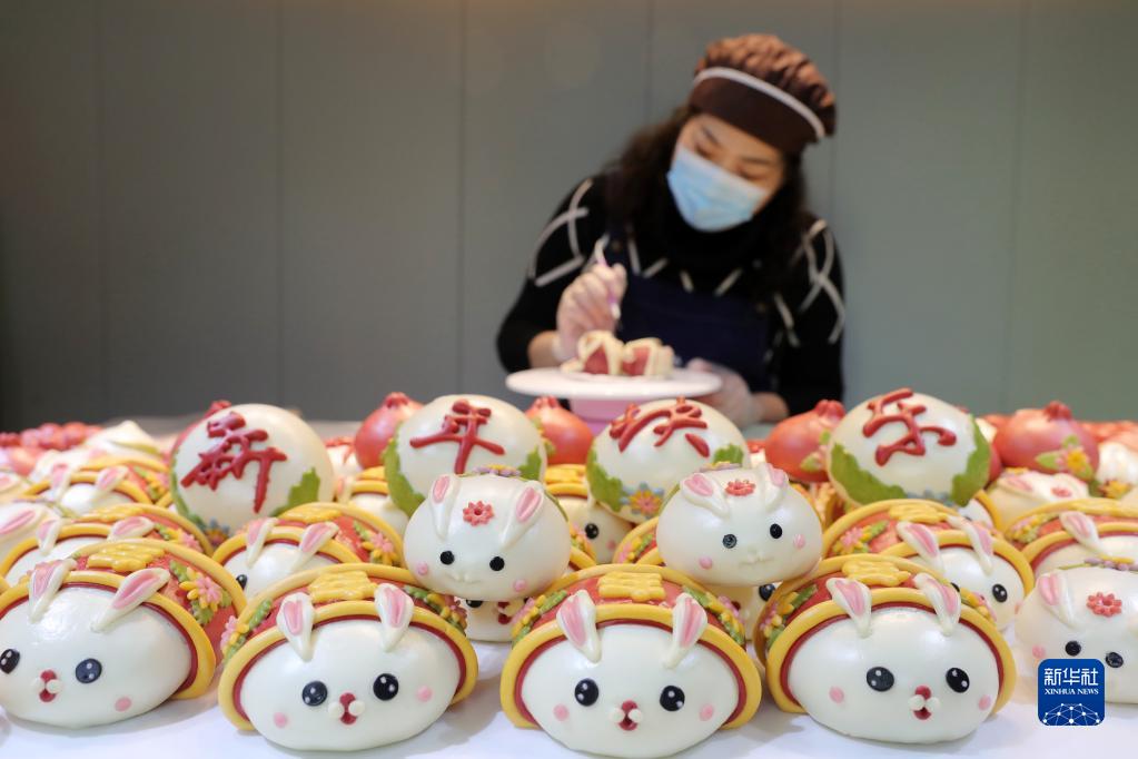 1月19日,安徽省淮北市一家果蔬面藝美食坊的面點(diǎn)師在制作“萌兔”花饃。新華社發(fā)(萬善朝 攝)