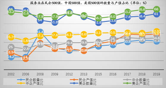 第三,一般服務,高新技術全面融合下加速轉型升級。傳統(tǒng)服務,規(guī)模優(yōu)勢突出。2002年44家民企500強、25家中國500強、14家世界500強批零企業(yè),產(chǎn)值分別占9.95%、1.92%、1.57%,利潤率分別為1.45%、1.38%、2.51%。2019年20家零售、26家批發(fā)民企創(chuàng)造了500強產(chǎn)值的6.92%、3.02%,利潤率仍只有1.51%、1.18%;14家中國500強零售、24家批發(fā)企業(yè)分別占產(chǎn)值的2.44%、2.85%,利潤率分別為5.44%、3.47%;29家跨國零售公司、4家批發(fā)企業(yè)分別創(chuàng)造世界500強產(chǎn)值的4.97%、0.5%,利潤率10.28%、4.33%。新模式、新平臺的出現(xiàn),變革了傳統(tǒng)供應鏈,但這種變革屬于轉移而非升級,國企、外企能夠憑借規(guī)模優(yōu)勢、產(chǎn)業(yè)配套提升利潤水平?,F(xiàn)代服務,加力數(shù)字經(jīng)濟。2008年4家信息民企創(chuàng)造了民企500強1.09%的產(chǎn)值、利潤率5.89%,超過中國500強1家企業(yè)、0.05%的產(chǎn)值和0.94%的利潤率,低于世界500強3家企業(yè)、0.6%的產(chǎn)值和8.69%的利潤率。2019年民企500強、中國500強和世界500強都是4家入圍,民企的產(chǎn)值只占0.34%,中國企業(yè)占0.74%,跨國公司占0.55%;利潤率方面民企10.52%,中國企業(yè)7.93%,跨國公司15.03%。服務貿(mào)易,壁壘障礙重重。2018年中國對外貿(mào)易超過30萬億元,電信、計算機和信息服務貿(mào)易平均增速17.6%,通信服務、建筑服務、計算機和信息服務、特許權許可、專業(yè)服務等服務貿(mào)易額占貿(mào)易總量的近50%。民企500強海外投資由2008年的112家企業(yè)、206個項目發(fā)展到2019年的241家企業(yè)、2345個項目,海外收入從2012年的5567億元上升到2019年的55393億元,增長895%。但壁壘不斷,摩擦不少,民企的應對需更加積極主動。