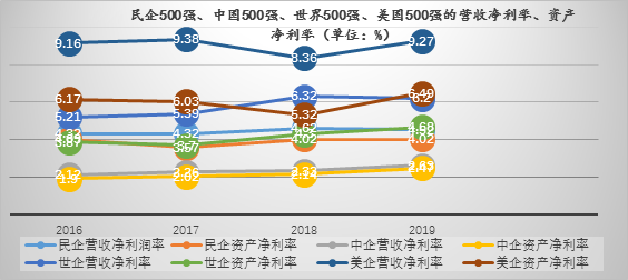 第三,效能提高,在開放的相關領域走到了世界前列。民企500強盈利能力穩(wěn)步增長,凈利潤總額從2002年的363億元上升到2019年的12891億元,增長了34.51倍,從僅相當于其他3個500強企業(yè)的12.62%、2.13%、1.52%上升到2019年的36.49%、16.78%、8.82%,如果剔除其他3個500強銀行業(yè)的份額(中國17059億元,占48.3%;美國2802億美元,占24.7%;世界500強6920億美元,占32%),2019年民企利潤總額相當中國500強的70%、美國的22%、世界的13%,成長性遠高于其他500強。從利潤角度看,行業(yè)制約突出。利潤率反映競爭力。2008年前受益于全球產(chǎn)業(yè)轉移,民企發(fā)展迅速;2009-2013年受金融危機影響,要素成本上升,利潤空間狹窄,產(chǎn)能過剩冒頭;2014年后數(shù)字技術發(fā)展迅速,柔性生產(chǎn)、智能制造穩(wěn)步推進,一批世界級先進制造業(yè)集群雛形初現(xiàn),利潤率以年均17.43%的速度增長。在全球高營收的行業(yè)如半導體元件、綜合商業(yè)、醫(yī)藥保健等領域,沒有中國企業(yè)上榜;在金屬冶煉、工程建筑、房地產(chǎn)、船務等行業(yè),中國企業(yè)表現(xiàn)突出;在金融、通訊設備、車輛與零部件中美企處于主導地位;在網(wǎng)絡與信息技術、通訊設備、新能源等領域民企走到了世界前列,利潤增幅遠高于其他3個500強企業(yè)的平均水平。從發(fā)展進程看,生產(chǎn)效率倍增。2002年民企500強的生產(chǎn)率為40.97萬元/人,是中國500強的119%、美國500強的17.53%,2018年增長到269.56萬元/人,增長5.57倍,是中國500強的114%、美國500強的83%,民企500強以13%的資產(chǎn)創(chuàng)造了27%的凈利潤,與跨國公司的生產(chǎn)率差距不斷縮小。2002年民企500強的人均凈利潤為2.11萬元,為中國500強的134%、美國500強的4%。2019年成長到12.19萬元,增長4.77倍,是中國500強的116%、美國500強的45%。但從全國工商聯(lián)的規(guī)模以上民企調(diào)研數(shù)據(jù)看,民企在整個國民經(jīng)濟的利潤占比從2002年的20%上升到2014年的35.1%峰值后持續(xù)下降,2018年下降到26.0%,民企國企之間的“利潤鴻溝”不但沒有縮小,反而明顯擴大。從經(jīng)營效率看,盈利能力下降。2002年民企500強、中國500強、世界500強的銷售凈利率分別為5.1%、5.4%、2.1%,2019年調(diào)整為4.5%、4.3%、6.6%;資產(chǎn)凈利率2002年分別為5.5%、1.0%、1.0%,2019年分別為4.0%、1.18%、1.6%,民營企業(yè)、中國企業(yè)的盈利能力一直處于下降通道,離“世界一流企業(yè)”還存在巨大差距。從換榜率上看,接續(xù)震蕩上行。民企500強的換榜率要始終高于中國500強、世界500強,由2012年的40家發(fā)展到2018年的104家、2019家的68家,說明大型民企發(fā)展一直處于不穩(wěn)定狀態(tài),并且新進企業(yè)整體效益始終低于連續(xù)上榜企業(yè)。從資本市場看,1998-2017年中國A股企業(yè)的平均資本利潤率為3%,美國上市公司1870-1970年間在10%以上,相差3-4倍,說明中國企業(yè)價值創(chuàng)造沒有與其規(guī)模擴張同步,要素利用效能較低。