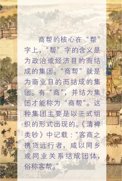 從字面意義上看,商幫的核心在“幫”字上,“幫”字的含義是為政治或經(jīng)濟(jì)目的而結(jié)成的集團(tuán)?!吧處汀本褪菫樯虡I(yè)目的而結(jié)成的集團(tuán)。有“商”,并結(jié)為集團(tuán)才能稱(chēng)為“商幫”。這種集團(tuán)主要是以正式組織的形式出現(xiàn)的?!肚羼灶?lèi)鈔》中記載 : “客商之?dāng)y貨遠(yuǎn)行者,咸以同鄉(xiāng)或同業(yè)關(guān)系結(jié)成團(tuán)體,俗稱(chēng)客幫。”
