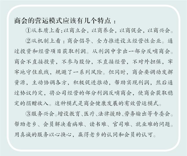 所以,商會(huì)的營(yíng)運(yùn)模式應(yīng)該有幾個(gè)特點(diǎn)。①從本質(zhì)上看:以商立會(huì),以商養(yǎng)會(huì),以商促會(huì),以商興會(huì)。②從機(jī)制上看:商會(huì)倡導(dǎo)、全力推進(jìn)設(shè)立經(jīng)營(yíng)性企業(yè)。通過投資和經(jīng)營(yíng)項(xiàng)目獲取利潤(rùn)。從利潤(rùn)中拿出一部分反哺商會(huì)。商會(huì)不直接投資,不參與股份,不直接經(jīng)營(yíng),不對(duì)外擔(dān)保,牢牢地守住底線,規(guī)避了一系列風(fēng)險(xiǎn)。但同時(shí),商會(huì)要調(diào)動(dòng)發(fā)揮資源,主動(dòng)協(xié)調(diào)各方,積極促進(jìn)推動(dòng),幫助實(shí)現(xiàn)利潤(rùn),然后通過協(xié)議約定,將公司經(jīng)營(yíng)的部分利潤(rùn)反哺商會(huì),使商會(huì)獲取穩(wěn)定的捐贈(zèng)收入。這種模式是商會(huì)健康發(fā)展的有效營(yíng)運(yùn)模式。③服務(wù)興會(huì)。增設(shè)教育、醫(yī)療、法律援助、勞務(wù)輸出等專委會(huì)。幫助老鄉(xiāng)、會(huì)員解決看病難、讀書難、官司難、就業(yè)難的問題。用真誠的服務(wù)以心換心,贏得老鄉(xiāng)的認(rèn)同和會(huì)員的認(rèn)可。