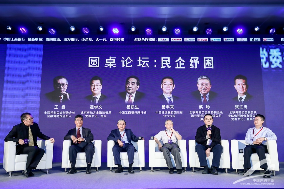 在全聯(lián)并購(gòu)公會(huì)創(chuàng)始會(huì)長(zhǎng)王巍的主持下,北京市地方金融監(jiān)管局黨組書記、局長(zhǎng)霍學(xué)文,中國(guó)銀保監(jiān)會(huì)特邀顧問(wèn)、中國(guó)工商銀行原行長(zhǎng)楊凱生,全聯(lián)并購(gòu)公會(huì)四川工作委員會(huì)主任、中國(guó)建設(shè)銀行四川省分行行長(zhǎng)楊豐來(lái),全聯(lián)并購(gòu)公會(huì)常務(wù)副會(huì)長(zhǎng)、國(guó)元證券股份有限公司原董事長(zhǎng)蔡詠,全聯(lián)并購(gòu)公會(huì)副會(huì)長(zhǎng)、中航信托股份有限公司黨委書記、董事長(zhǎng)姚江濤五位嘉賓圍繞“民企紓困”這一主題展開討論對(duì)話。